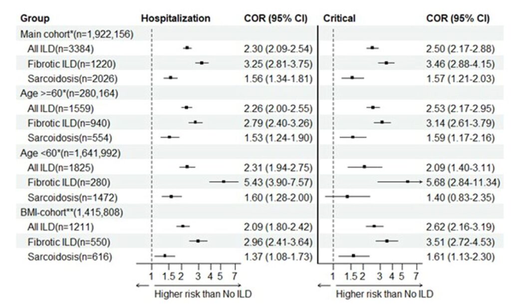 ILDはCOVID-19重症度の上昇と関連し、ILDなしの患者と比較した条件付きオッズ比(COR)(95%信頼区間)は、