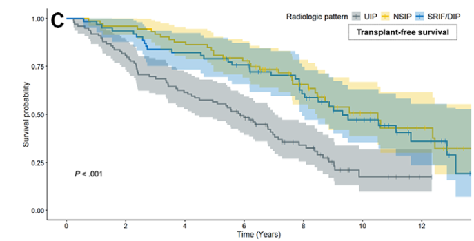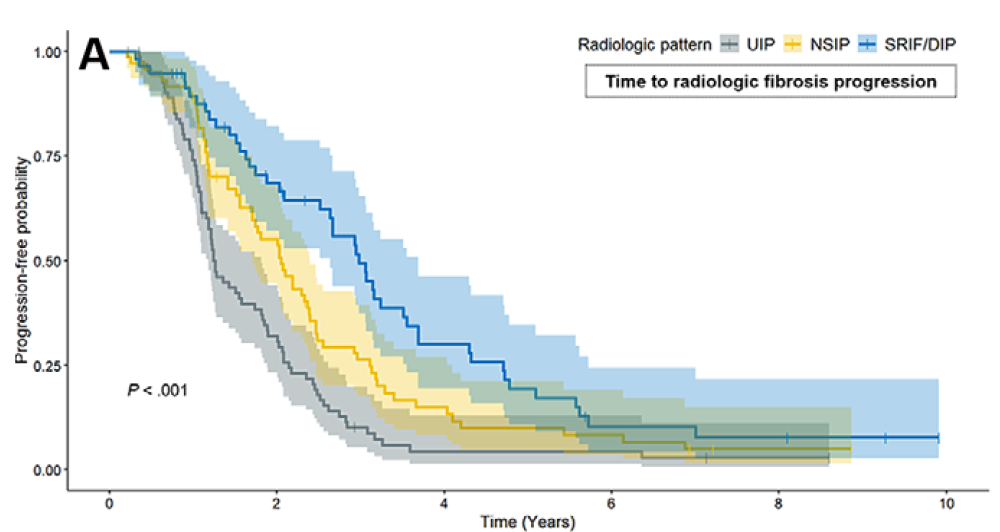 線維化パターンは線維化の進行速度と関連し、UIPが最も速く(中央値1.2年)、次いでNSIP(中央値2.1年)、SRIFまたはDIPが最も遅かった(中央値3.0年;P<.001)。