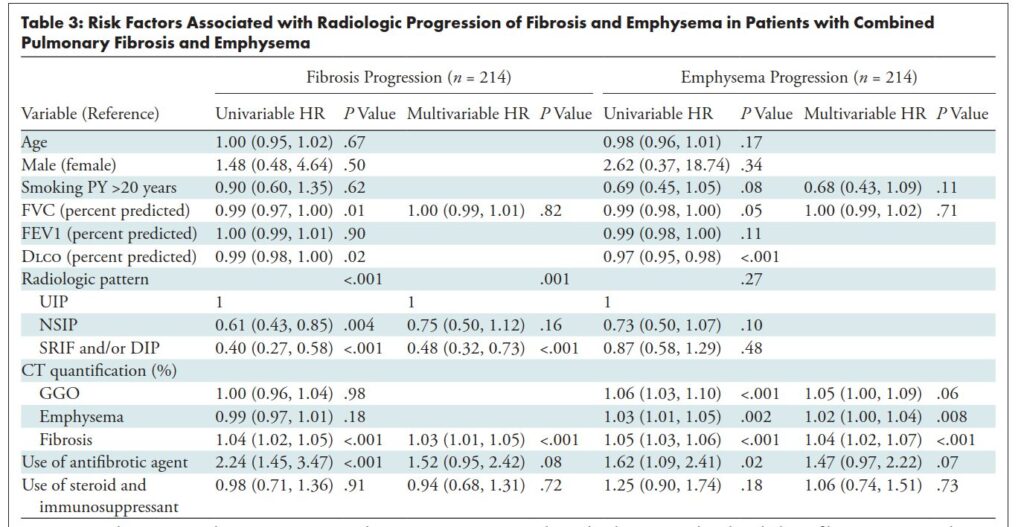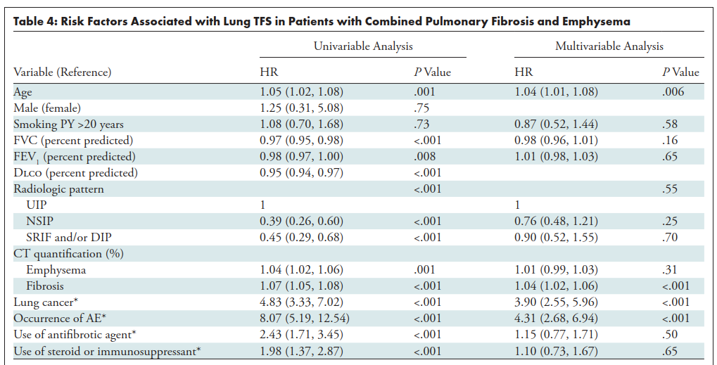しかし、線維化パターンは、肺気腫の進行(単変量P=.27)、肺移植なし生存(多変量P=.55)、時間依存性肺癌(多変量P=.65)、急性増悪(多変量P=.64)と有意な関連を示さなかった。