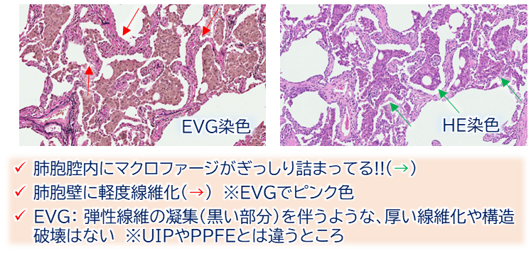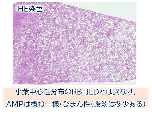 病理 | 肺胞腔内にマクロファージ蓄積(びまん性) | 気管支周囲にマクロファージ蓄積(限局性) |