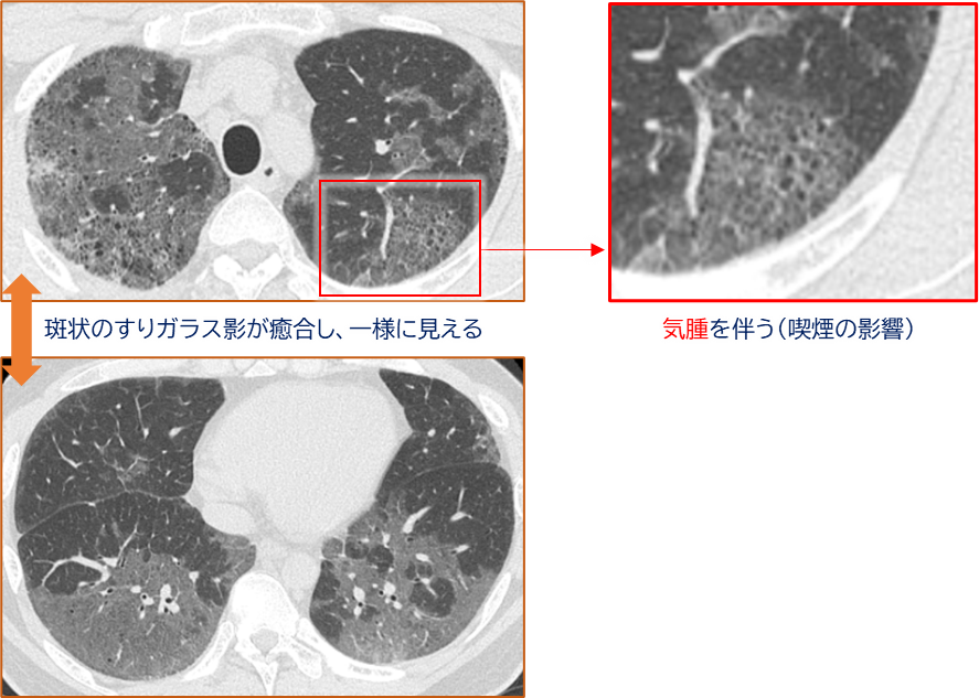 CT所見 | 癒合性すりガラス影(末梢・中下肺) | 小葉中心性結節と軽度すりガラス(上肺優位) |