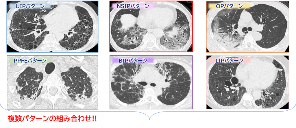 特にCTD-ILDやHPなどの二次性間質性肺炎では、複合パターンが出やすい。