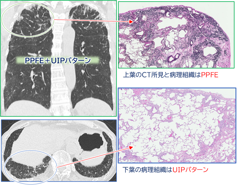 PPFE + UIP | PPFE患者で下葉にUIPが共存することがある。下葉のUIPパターンが優位だと、特発性ならIPFとして扱われることも多い。予後不良。 |