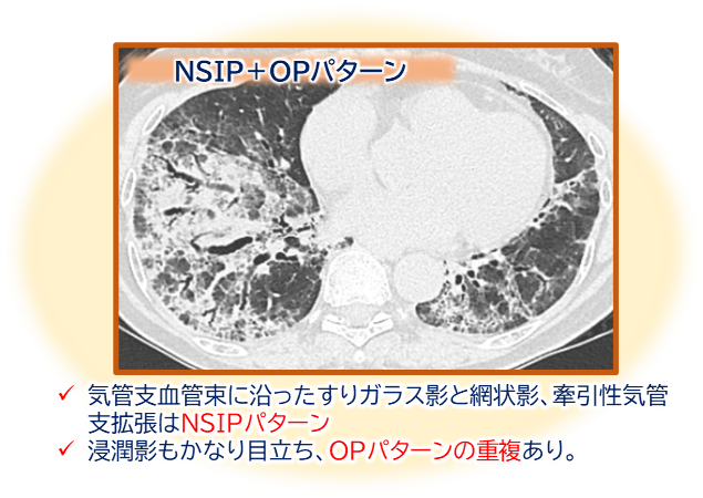 NSIP + OP | 皮膚筋炎・多発性筋炎などに多い。 |