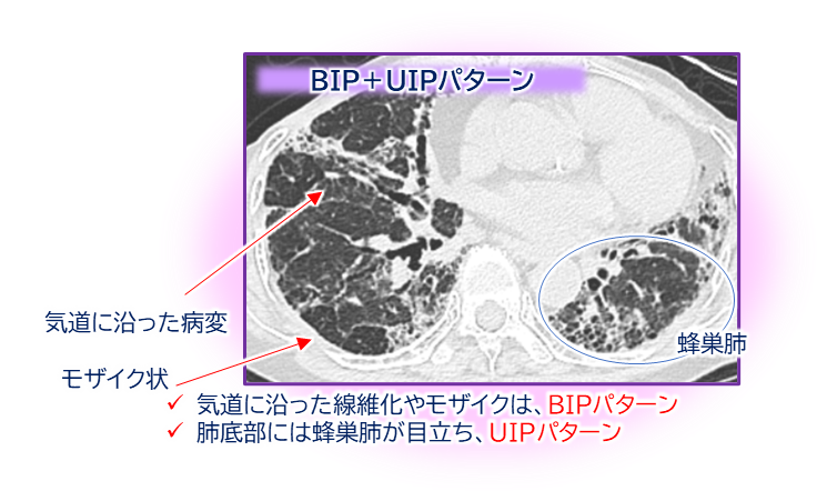 UIP + その他のパターン | CTD-ILDや過敏性肺炎などで多くみられる。UIPがあれば予後はUIPが支配。 線維性HPでは、UIP±BIP±NSIP±PPFEパターンという恐ろしい組み合わせもありえる |