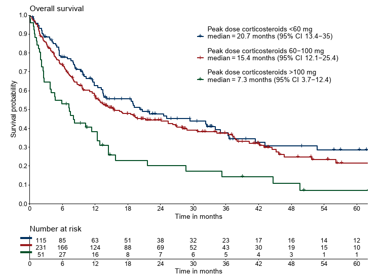 irAE治療のためのステロイド最大投与量は、生存不良と関連し得るので、必要性と不利益を天秤にかけよう。