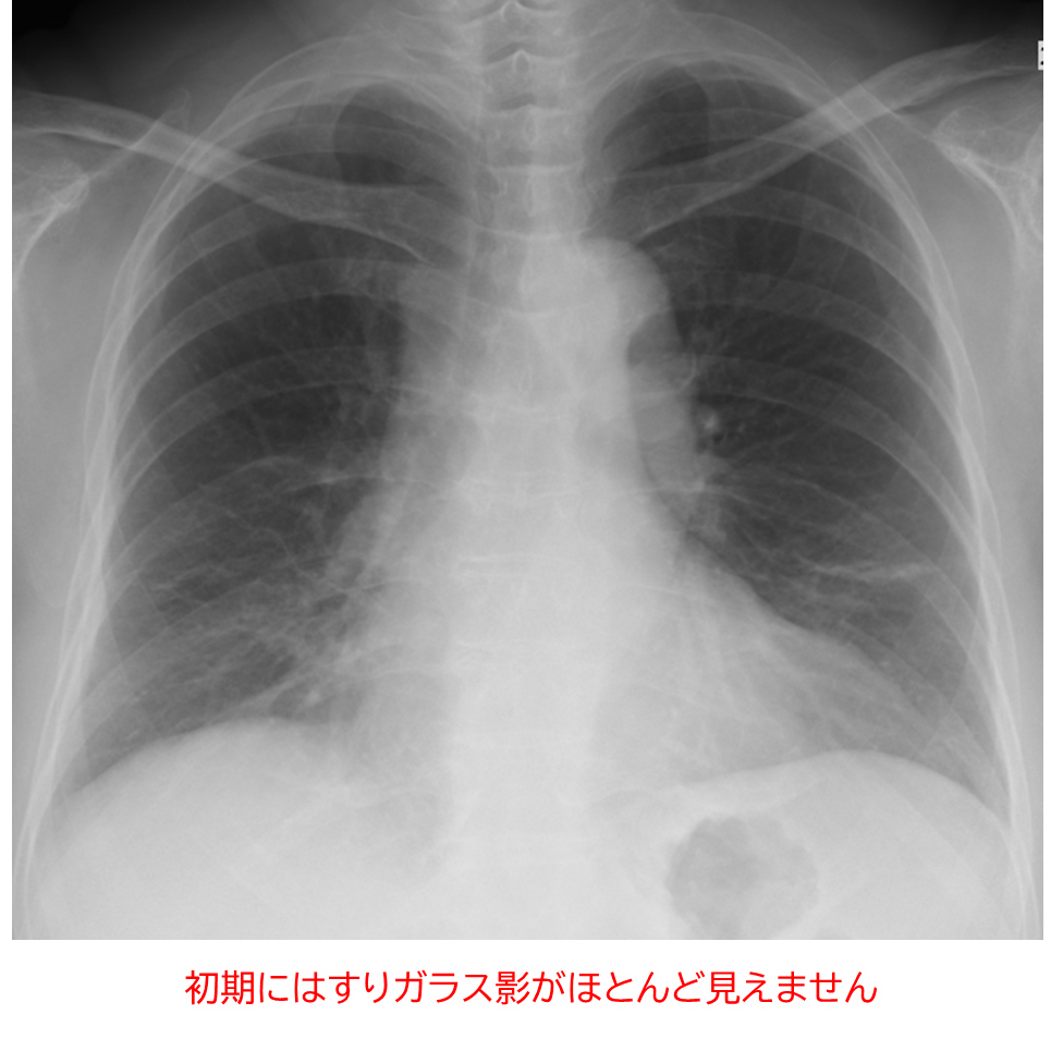 - PCPの初期には、胸部X線写真では明らかな異常が認められないことも少なくありません。