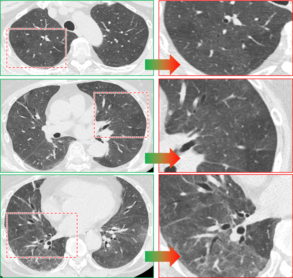 - 両側性・対称性の すりガラス陰影(ground-glass opacity; GGO) が最も頻出。