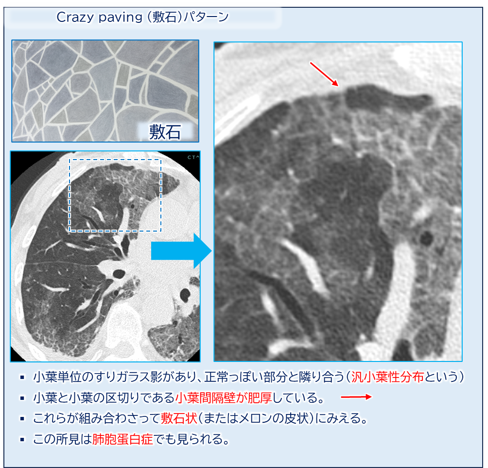 - GGOに加えて、小葉間隔壁肥厚/内小葉線状影が重なって “crazy paving(敷石状陰影)” を呈することあり。