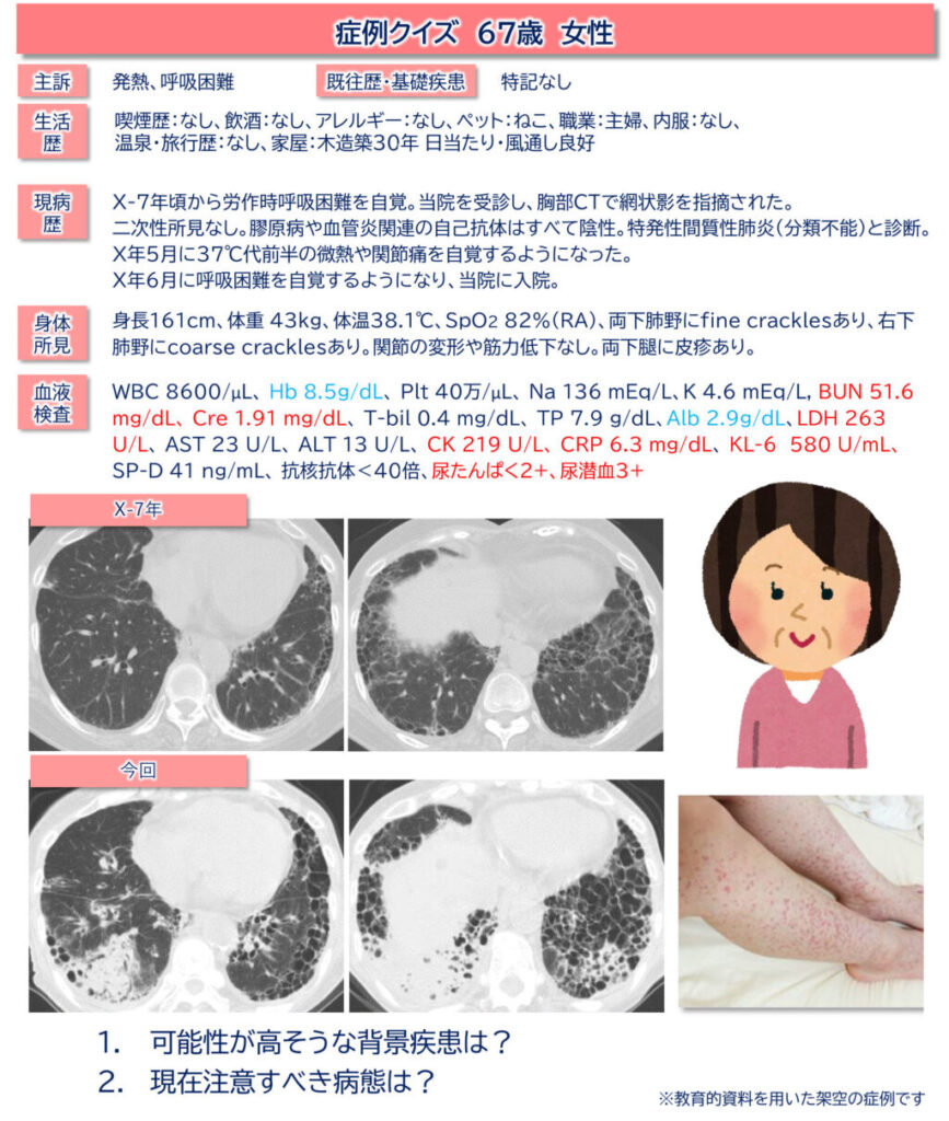 本症例では、これまで二次性ILDを示す所見はなく、「特発性間質性肺炎(分類不能)」として経過観察されていました。