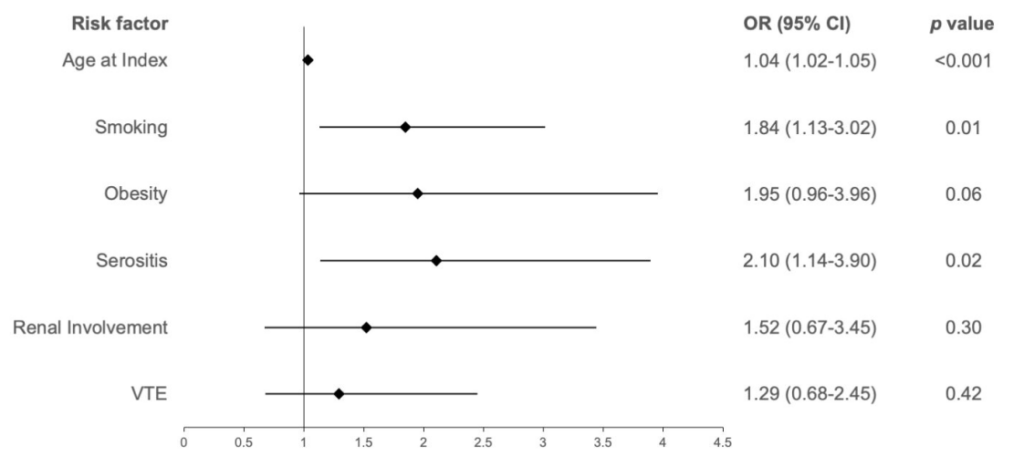 図2. 多変量ロジスティック回帰分析に基づく、全身性エリテマトーデス(SLE)における間質性肺疾患(ILD)発症の独立した危険因子。