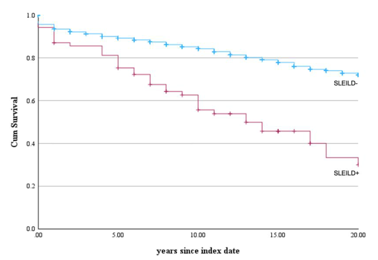 図3. Kaplan-Meier生存曲線:SLEILD⁺と、ILDを有さないSLE患者(SLEILD⁻)