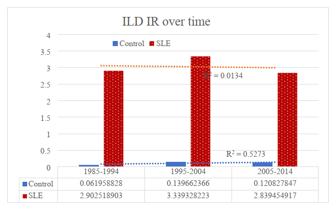 図1. 全身性エリテマトーデス(SLE)患者および対照群における間質性肺疾患(ILD)の発症率(1000人年あたり)の経時的推移。